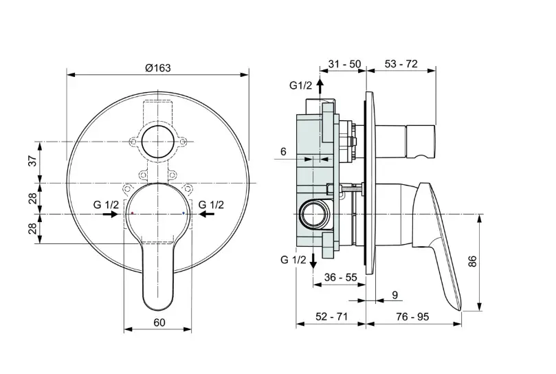 - warm/koud-aanduiding op de hendel, verchroomde afdekking
