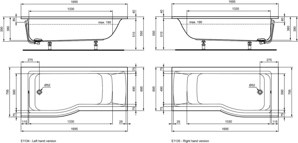 - afvoer- en overloopgarnituur niet meegeleverd, moet apart worden besteld