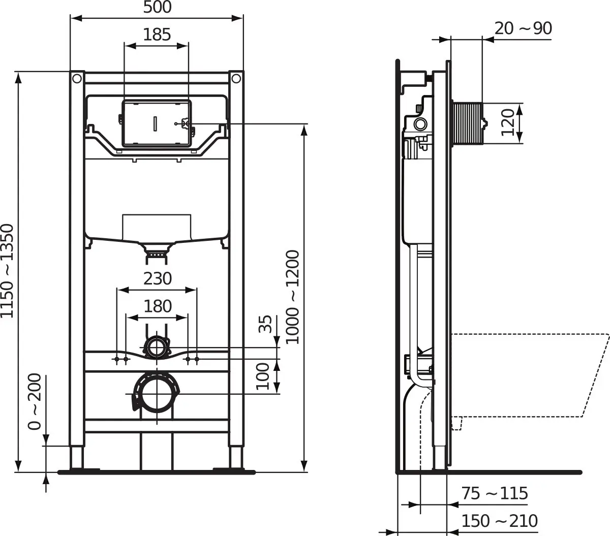 - voor wandclosetten met montageafmetingen van 180 of 230 mm